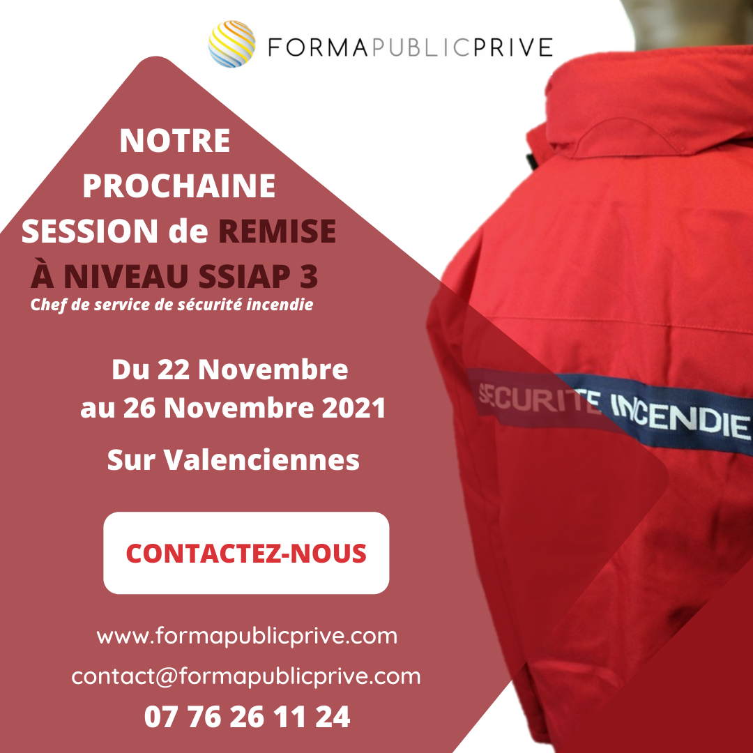 La structure Forma Public Privé vous propose une formations REMISE À NIVEAU SSIAP 3 sur VALENCIENNES du 22 Novembre au 26 décembre 2021.