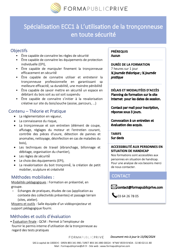 - La tronçonneuse et son entretien (élément de coupe, affutage, réglages du moteur et l’entretien courant, contrôle des pièces d’usure, détection de pannes et anomalies, nettoyage, désinfection en cas de maladies du bois),